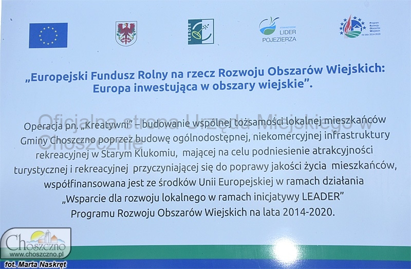 Operacja pn. ?Kreatywni? ? budowanie wspólnej tożsamości lokalnej mieszkańców Gminy Choszczno poprzez budowę ogólnodostępnej, niekomercyjnej infrastruktury rekreacyjnej w Starym Klukomiu, mającej na celu podniesienie atrakcyjności turystycznej i rekreacyjnej, przyczyniającej się do poprawy jakości życia mieszkańców, współfinansowana jest ze środków Unii Europejskiej w ramach działania ?Wsparcie dla rozwoju lokalnego w ramach inicjatywy LEADER? Programu Rozwoju Obszarów Wiejskich na lata 2014-2020.